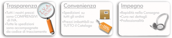 I Prodotti. Il nostro catalogo vanta una vasta scelta di prodotti dei marchi più prestigiosi,i quali saranno accompagnati Confezione Originale da Garanzia Ufficiale del produttore valida per 2 anni. La trasparenza. Ci impegniamo costantemente per rendere la nostra offerta competitiva e trasparente. Su tutti i nostri prodotti esponiamo i Prezzi IVA INCLUSA.